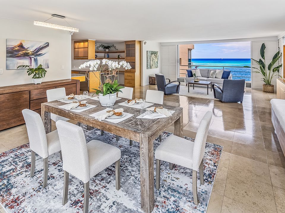 This stunning fully furnished two-bedroom, two-bath oceanfront condo offers a perfect blend of luxury and tranquility. With a very large, open, and spacious floor plan, the living areas flow seamlessly, providing ample room for relaxation and entertaining. This ocean front condominium also has breathtaking views of both the park and Diamond Head surround you, complemented by lush greenery right outside your windows. The condo has been beautifully remodeled, featuring a modern kitchen complete w a custom marble feature wall and updated bathrooms. Features secured parking and high end appliances. The elegant white shutters, custom Maplewood built ins, and travertine floors add a touch of sophistication throughout. Living here feels like being in a resort, with access to a heated swimming pool and shaded areas with umbrellas just downstairs. Plus, you can open the gate and step directly into the beautiful ocean, making this property an unparalleled oasis for beachfront living. Available for either a 6 month or 12 month lease term. Also available for a 3 month lease term at a different rate. Inquire with listing agent
