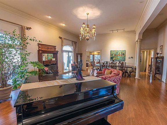 Distinguished living defined - located in the city & majestically set at the apex of 6.91 +/- acres w/stocked pond, this beautiful 4 BR, 3.5 BA home is classically styled & elegantly decorated. Surrounded by the best that nature can offer, this home boasts 4695 +/- sq ft o finished living space offering the perfect floor plan. As you enter, you will be welcomed by the great RM with its prominent high ceilings, HW floors & large windows. The kitchen comes w/granite countertops, Viking appliances (cooktop/fridge/wine fridge) & eat-in area open to FR w/oversized windows providing natural light & views of mother nature. Off the FR is access to the covered back porch with its own dedicated natural gas line to the fire pit and grill, perfect for relaxing & entertaining. The well-appointed master suite w/large BR & updated BA offers a large stand-up double shower with multiple spray nozzles & double vanities. An additional BR w/ private BA plus a library/study that can be utilized as BR if needed, half BA powder room, large laundry room & 2-car garage are on main level. The walk-out BSMT features FR w/movie theater, fireplace, and more! New security system in 2020.