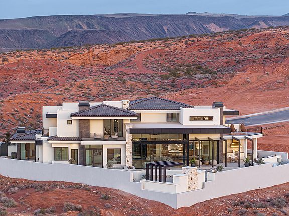 Welcome to the Dennis Miller Homes 2026 Parade Home. An Architectural Masterpiece with Panoramic Zion Views! Set on a breathtaking lot with uninterrupted views, this 6,066 sq ft estate blends timeless craftsmanship with architectural brilliance. Built by Dennis Miller Homes and designed by McQuay Architects, this residence offers a quiet kind of luxury where elevated design meets intentional living. Welcoming you with a majestic water feature, the entry envelops you in soft lighting, elevated planters, and the calming sound of water flowing through architectural steel a peaceful threshold that sets the tone for the home's quiet elegance and lasting comfort. Inside, natural light moves effortlessly through oversized windows, offering beauty and privacy at every hour of the day. The chef's kitchen features Sub-Zero and Wolf appliances, double islands, custom oak cabinetry, and a walk-in butler's pantry, designed for both elevated living and everyday ease.
