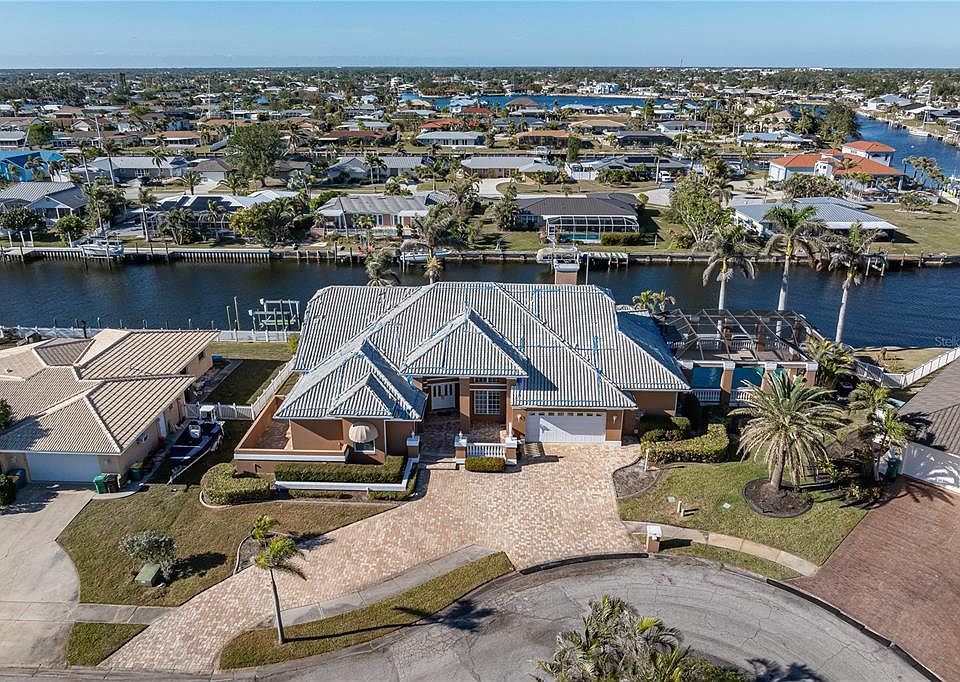 GORGEOUS, TWO-STORY HOME W/ALMOST INSTANT, SAILBOAT ACCESS TO CHARLOTTE HARBOR AND WIDE INTERSECTING CANAL VIEW. Home is located on an oversized cul-de-sac lot w/210 ft of seawall. Home had Hurricane damage from Hurricane Ian and is being sold AS IS. **HIGH AND DRY** from Hurricanes Ian, Helene & Milton – no rising water intrusion. This is the property that can reach maximum potential at an affordable price. SOME REPAIRS ARE NEEDED. Seller has roof quote and roofer ready. The well laid out floor plan is comprised of 3,800 sq ft under air, 4 beds and 4.5 baths and a large showcase pool. Architectural details include gleaming tile floors, crown molding, arched doorways & a marble fireplace in the family room. Spacious formal living room & formal dining room are perfect for entertaining. The chef-inspired kitchen has granite counters, stainless steel appliances, wood cabinetry, a mosaic tile back splash, pantry, breakfast bar & recipe desk. The adjacent breakfast nook overlooks the canal view. Relax with friends & family in the spacious family room. Laundry room has water views that turn even the mundane into something tropical. Full bath by laundry doubles as a pool bath w/access to the lanai. The 1st floor master suite has walk-out access to an enclosed patio & a spa-like master bath. A guest room (that makes a fantastic home office) w/private half bath complete the 1st floor. Upstairs offers a small reading nook at the top of the stairs plus two, large guest rooms w/new luxury vinyl tile flooring & two guest baths. Both rooms have views out to the canal below. Outside, the home has a Mediterranean-inspired lanai w/brick paver deck, in-ground pool & waterfall feature that combine to create an outdoor oasis. Lanai has summer kitchen & brick paver deck. Walkways lead to the extended, 100ft Trex dock w/NEW 13,000 lb boat lift. Water & electric hook-ups are available dockside. Other features include brick paver circular driveway, some hurricane protection, brick paver walkways & patios plus an oversized garage. The location, size, awesome pool and dock setup make this a SPECTACULAR, unique deal for the buyer willing to put in some work. The lot and size could not be replicated for anywhere near the price.