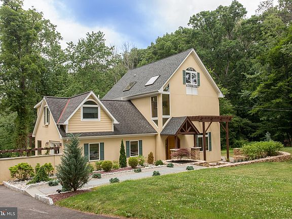 Inspired by European travels, this unique courtyard home has a Mediterranean feel on the outside and warm modern craftsman style inside. Set majestically on 2.41 acres and just minutes to Hopewell Borough. The crisp hardscaping and lush landscaping that circumnavigate the home were designed by the owner/artist and masterfully executed, creating stunning curb appeal. Upon entering the home the three-story foyer exemplifies the attention to detail, extensive custom mill work, and natural light that are found throughout the home. Cumaru wood floors extend from the foyer into the open plan living and dining room. This exceptional space offers a stone wall feature, a wall of oversized windows framing beautiful nature views, and a glass door leading out to a private sitting porch. The impressive eat-in kitchen boasts stainless steel appliances, including a five burner stove, granite counters, center island, and sliding glass doors leading out to a slate patio set beneath a pergola with long distance views. The kitchen opens onto a lovely sitting area with electric fireplace, bamboo floors and outside access, and a powder room is conveniently located around the corner. Upstairs, the primary bedroom suite is a true oasis with a wall of windows overlooking the backyard, a large walk-in closet with custom storage, and pocket doors that open onto the sumptuous ensuite bathroom with double vanities, stone tile floor, soaking tub with elegant wood surround, and a large glass walled shower. The open landing creates a charming sitting area, while another ensuite bedroom with walk-in closet and laundry complete this level. The third floor boasts two more generously sized bedrooms, and a full hall bathroom with double vanities. The finished walk-out basement with powder room offers additional living space, and is currently used as a yoga studio. Pass through an idyllic courtyard with ivy covered walls on your way to the over-sized four-car garage with a full second level for abundant storage. Enjoy four levels of elegant living, utter privacy, and beautiful views from every window in this special home surrounded by nature, yet close to everything.