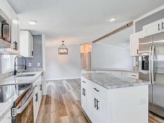When someone writes an ad and they say the features are ''too much to list'', the list is usually over but not with this one, it might actually have ''too much to list''. Wow! So many upgrades so buckle up, This home features a brand new kitchen-cabinets, granite counters, center island and stainless appliances. LOOK at that kitchen! Both bathrooms have been completely overhauled including new vanities, all new plumbing fixtures, new tub and shower. All electrical outlets and switches are new and they are all mounted in new boxes. Almost all of the wiring has been updated as well & all of the ceiling fans and lighting fixtures are new and also mounted in new boxes. All three bedrooms come with large, functional walk-in closets. There is a full laundry room as well. The fireplace has been cleaned and inspected already for your peace of mind. The tasteful combo of the new paint color, new blinds and new flooring throughout makes it look, feel and smell brand new. Anything else? Yes, quite a bit more. The chimney has been cleaned and serviced for peace of mind. The roof is 2 years new and there is a brand new HVAC unit, inside and outside. Even the duct work has been professionally cleaned and disinfected with a 3 year guarantee. Now, finally to my favorite part about this house. You can stand on the new front porch, new side porch or the huge, new deck out back and you will not see a single house, anywhere, just trees, even across the street, you are surrounded by trees! Situated on roughly 2.5 acres, this not just a home but a daily retreat to peace, quiet and privacy. The huge lot, fresh landscaping, beautiful crepe myrtles, blackberry and blueberry bushes leaves you wondering, ''What else could this home possibly offer?'' Well, how about the 29x21, brand new, detached, 2-car garage with power? Conveniently located near 17 for easy access to VA, the Outer Banks and all of NE N.C. Don't walk; run to make an appointment for this one. It absolutely will not last long