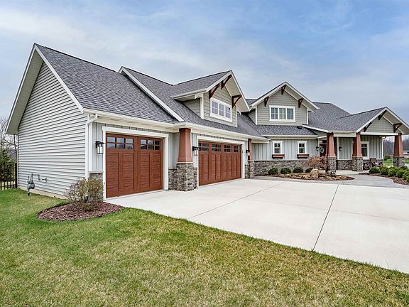 Absolutely stunning better-than-new 1.5 story custom built by Star Homes boasting a split bedroom floor plan with main level primary, daylight basement with full wet bar & huge enclosed back yard edged by the Pufferbelly Trail—in NWAC school district! Located in highly desirable Aslan Passage on a quiet cul-de-sac & nestled on generous 0.51 acre lot, this 5 bedroom, 3.5 bath 2020 built home is beautiful inside & out & has been impeccably maintained with obvious pride of ownership. Presenting max curb appeal with professional landscaping (irrigation system for easy care), attached 3 car garage & oversized drive, you’re sure to fall in love the moment you arrive! Inviting covered front porch & impressive front entry with twin sidelights & transom window opens to bright & welcoming atmosphere complemented by gorgeous wood LVP & high-quality craftsmanship. Foyer with wainscoting leads to main open concept area featuring a spacious great room with gas log fireplace flanked by build-ins & giant wall of windows with peaceful back yard nature views. Formal dining next to living perfect for entertaining with exposed beam ceiling & sliding glass doors to walk-out patio. You’ll also notice modern lighting elements, luxury finishes & attention to detail throughout. Chef’s delight eat-in kitchen is sure to wow with 2 islands (1 with seating), top of line appliances (all stay including wet bar fridge & wine cooler), abundant custom cabinetry, hard surface counters & tile backsplash. Half bath & big laundry/mudroom with sink & build-ins by garage entry. Large primary bedroom has en suite bath with dual sink vanity, walk-in shower & 2 walk-in closets, plus 1 more main level bedroom that works great as a home office. 2 more comfortably sized bedrooms upstairs linked by jack n jill bath. Final bedroom is downstairs & currently being used as home gym. Fantastic lower-level ideal for man cave/2nd living/games & rec with amazing wet bar & another full bath with tub/shower. Massive dry storage area could be finished to make home theater, if desired. Expansive back yard contains both a covered patio & extended bonus stamped concrete patio with built-in fire pit & room for dining al fresco, or simply kicking back, relaxing & enjoying the surrounding scenic views. Lot backs up to Pufferbelly Trail & wood line providing additional privacy. Minutes from I-69 with easy access to nearby shopping, dining & groceries along Dupont Rd. Reach out today!