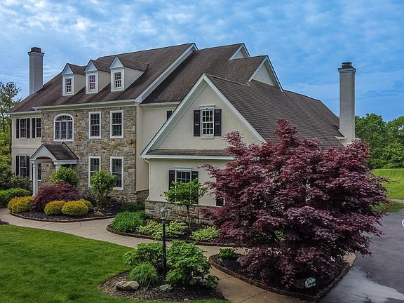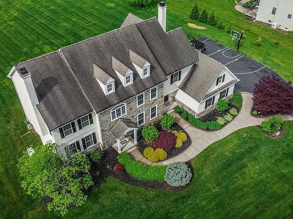 Welcome to this stunning executive home in sought after Harleysville, where luxury meets tranquility on beautifully manicured 2 acres. Every detail has been meticulously maintained and updated throughout this expansive 5-bedroom, 4-full, and 2-half-bath residence. Step into the grand foyer adorned with crown molding and wainscoting, leading to the formal living room featuring a gas fireplace, and the large, elegant formal dining room boasting a tray ceiling and both offering additional wainscoting. The dining room seamlessly connects to the gourmet kitchen via the Butler’s pantry, showcasing stainless steel appliances, a gas stove, double oven, granite counters, and a spacious island that comfortably seats five. The kitchen includes a lovely breakfast area with plenty of room for all of your guests. Adjacent is the two-story family room with vaulted ceiling, floor-to-ceiling windows offering spectacular light, and a cozy wood-burning fireplace with a stone mantle. Slide open the glass doors from the breakfast area to the patio adorned with brick pavers, providing ample space for entertaining, including a fire pit and a sprawling private backyard. This expansive backyard is graced with both a full sprinkler system as well as an invisible dog fence. A formal office with French doors and cherry wood built-in bookcases overlooks the serene backyard. Completing the first floor are a three-car garage, mudroom with cubbies, an additional informal powder room, and additional access to the front exterior. Ascend the formal front staircase to discover double doors leading to a tranquil sitting room and the formal master bedroom with a double tray ceiling, recessed lighting, and a grand walk-in closet. Indulge in the en suite formal bathroom featuring a Jacuzzi tub, oversized two-person shower, and his and hers separate sink areas. Three additional large bedrooms await on the second floor, including a princess suite with its own full bath, while two bedrooms share a Jack and Jill bathroom. A sprawling laundry room with built-ins and a built-in desk area perfect for a home office or study space complete the second floor. Descend the back staircase to the fully finished walkout basement boasting a wet bar, huge entertaining room, an additional office space, a full bathroom, and ample storage. Thoughtfully added solar panels not only cover the cost of electricity but also generate income for the seller. A whole house generator ensures comfort no matter the weather. Conveniently located near the turnpike, major routes, and shopping amenities including the new Whole Foods and Target, this home truly has it all.