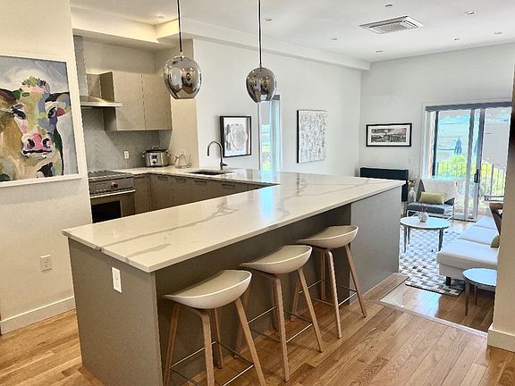 Located on the Harborwalk in East Boston’s most desirable neighborhood, this modern 2020-built condo features breathtaking views of Boston Harbor, a private roof deck, and deeded garage parking. One of the true gems of Jeffries Point, this bright, south-facing townhouse was designed by acclaimed Merge Architects.The first level features a chef’s kitchen with Wolf/Sub-Zero appliances, Arrital Italian cabinets, and Calacatta Quartz countertops. High ceilings, a sunken living room, and a walk-out balcony make the living area feel open and expansive. A convenient half bath off the kitchen and a gas fireplace in the living room round out the space as ideal for living and entertaining.The second level contains two bedrooms and two full bathrooms. The primary bedroom with en suite bath has a sizable walk-in closet. Both upstairs bathrooms feature impeccable tilework and lighted mirrors. Walking distance to restaurants, E.B. Shipyard, parks, and playgrounds.