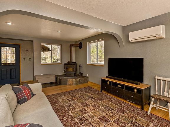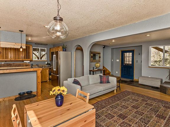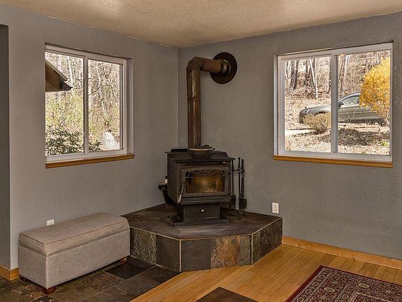 Multiple offers received. Highest and best by 12pm 3/20. Stunning mountain oasis! This beautiful home has unique artistic built-ins at every turn. The cozy wood stove fireplace and elevated hearth are great for those cold winter nights. There are beautiful curved architectural archways in the great room & custom wood trim throughout. The kitchen offers bar and office space as well as gas range, custom countertops and cabinets. There are large covered porches on each level that offer a relaxing treehouse feel and are great for entertaining. The upper level also features an office nook, unique circular windows and an adorable little loft nook off of the guest bedroom. Outside of the home you will find ample yard space, a fenced area for pets and a circle driveway. The yard has beautiful landscaping with fruit trees and a focus on native plants for pollinators. The detached cottage studio is great for an office, guest space or any number of creative uses. Short term rentals allowed.