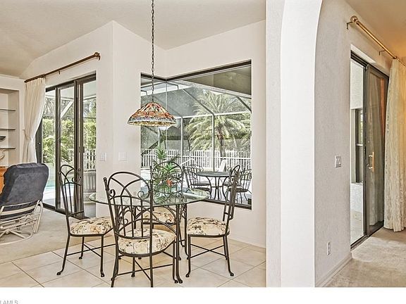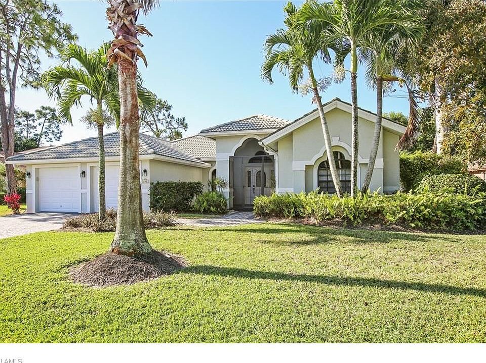 H.10637 - Appealing custom built home, offered turn-key furnished at the end of a quiet cul-de-sac street in the Palm River section of N. Naples. The home features 3 generous-sized bedrooms, large open kitchen and family room/den, plus combined living and dining room and oversized pool (30x13) w/ dual heating - solar AND electric heat pump, inside lanai planter and water feature. The rear lanai has a desirable sunny, southern exposure with large covered area for shade. With the addition of a built-in sound system and 6 cartridge CD changer + speakers throughout the home & lanai the home is perfect for poolside relaxing or entertaining. Other distinctive features include a security system, well water supplies irrigation system, vaulted ceilings, custom closets, plantation shutters, decorative banding around front windows & door, brick-paver walkway and large driveway, tile roof, lending to great curb appeal/ambiance inside to enjoy living in Sawgrass of Naples. It is a real plus that you will be conveniently located very close to Gulf Beaches and many healthy food markets, upscale shops and popular restaurants. What are you waiting for? Bring your groceries!