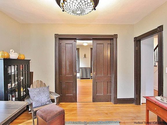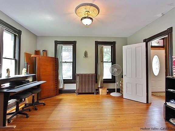 Stunning Victorian located in the heart of thriving Uptown Kingston! The home flows nicely together offering an open layout with four bedrooms and one and a half baths. Step inside as you are graced with high ceilings, gleaming hardwood floors and beautiful pocket doors. Off the kitchen there is an addition with two bonus rooms that can be used as an office/ studio/bedroom with sliding glass doors for a separate back entrance. New baseboard heat, water filter system, and piping was installed which allows for washer/dryer and a potential second bathroom. There is a sink hooked up as well. First floor has 9’ ceilings, a living room, dining area, two bedrooms and a kitchen. Elevate to the second level with two bedrooms, an office and bathroom filled with natural sunlight . There is a walk up attic in between the bedroom closets which offers room for storage and fresh Hudson River air breezing throughout upper home. Basement is unfinished with a toilet, swap sink and washer and dryer. Solar panels, original radiators, moldings, and glass stained door are a few special touches to this home. Step outside to your own private yard situated on .30 of an acre offering original Victorian Grey Stone slab patio, fenced in backyard, off street parking and a spacious key lock shed for storage. In addition there is electric hooked up in the yard. Walking distance to local restaurants, shopping, Trailways bus station and just under 2 hours to NYC, don't miss out on a great place to call your own!