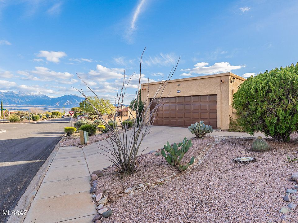 This one has the view you have been waiting for. Sitting on a hill overlooking the Santa Cruz River Valley with magnificent views of the Santa Ritas and Madera Canyon. The corner unit property is located at the furthest west end of Camino Kino so there is no through traffic. You only have one neighbor to your west. There is a full size 2 car garage, upgraded granite counter tops and beautiful ceramic tile throughout most of the home. A great view is the #1 search criteria for new buyers moving to the area. Come take a look you will not be disappointed.