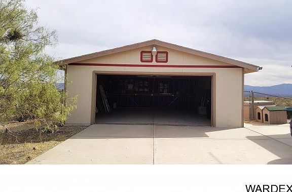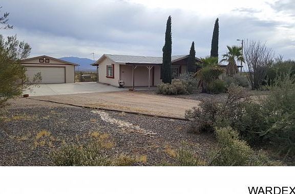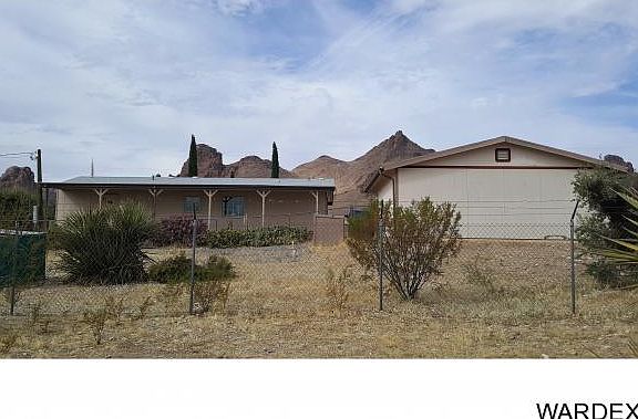 BEAUTIFUL LOCATION nestled in the foothills of Unit 8 close to the Black Mountains with majestic panoramic mountain and valley views, beautiful rock formations and close to McNutt Wilderness area for hiking, biking and riding. Peaceful oasis of 4.70 acres with a well cared for 3BR, 2BA, Cavo MH with 1,248 square feet of living space and a split floor plan. The home has upgraded features including built in sauna in master bath, stone counters, upgraded fixtures, nicely appointed kitchen, newer heat pump, views out every window and security shades on all windows and doors. Easy care rock and mature desert landscaping front and back, concrete walkways, concrete parking area, front and rear covered patios. Detached 2 car garage and 5' chain link fencing. Unobstructed views with BLM land directly across the street. Washer, dryer, refrigerator and some furnishings will stay. Enjoy some of the most beautiful views from this great location with easy access all the way to the property. Don't miss out on this great home, schedule your personal tour today!