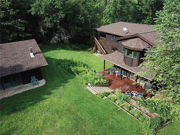 One-of-a-kind property in western Wisconsin near Lake Pepin, w/ a spacious home/lodge and guesthouse, nestled into 20 acres. End of road privacy w/ nearby boat launches, sailing, restaurants, shops & scenic bluffs. Over 4000 sq. ft house...& in 1998 approx. 3,000 extra feet added + 20 x 34 Guest House has 3/4 bath, sauna, wood stove & kitchen rough in. Master suite has fireplace & full bath. 2 other baths w/ steam showers. 20 x 200 shed.