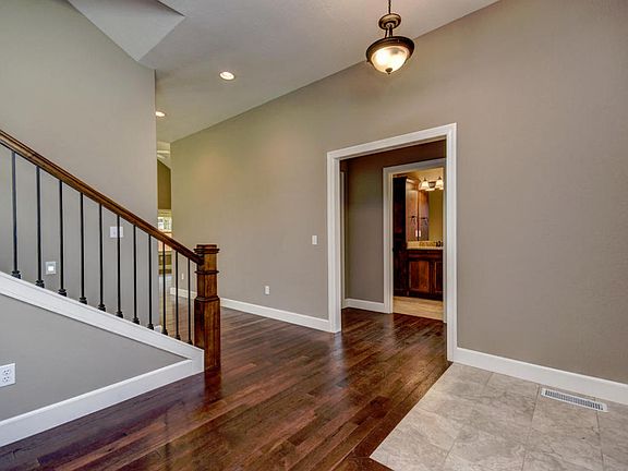 Beautiful brand new quality built home which features dark stained hickory flooring, granite counters throughout, varying ceiling treatments, some with indirect lighting. A bonus room at the entrance could be an office, music room, or parlor. The living room, dining & kitchen are all open to each other. A stone gas fireplace is in the great room/living area. Kitchen has large eating bar, stainless steel appliances, stone sink & knotty alder cabinetry. A tile insert defines the dining area. The master suite has a tile walk-in shower, jetted tub, double vanities & a large walk-in closet which is conveniently located next to the laundry room. Upstairs is a 4th bedroom with bath. Also has in ground sprinklers, french drain, high efficiency HVAC system, 2x6 walls & a large covered deck.