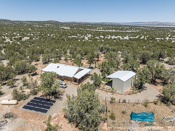 Now taking backup offers. STUNNING OFF-GRID SELF-SUSTAINABLE MOUNTAIN HOME.WITH PLENTY OF WATER, sitting on 21 beautiful acres. Just 20 minutes from the quaint town of Seligman and Historic Route 66, you will be delighted with this 2022 Custom-built home with incredible craftsmanship including total whole -house spray foam envelope for outstanding energy efficiency. The well runs off its own solar and produces over 100 gallons per minute. The 48V, 12kw Soi-ark solar system with backup Generac 22kw generator. On grid power is close by for future hook up if you desire. Open kitchen and living area with cathedral ceilings, two master bedrrom suites, walk in shower, deep soak tub, two walk in closets and 9' ceilings throughout. The RV garage and covered carport/workshop