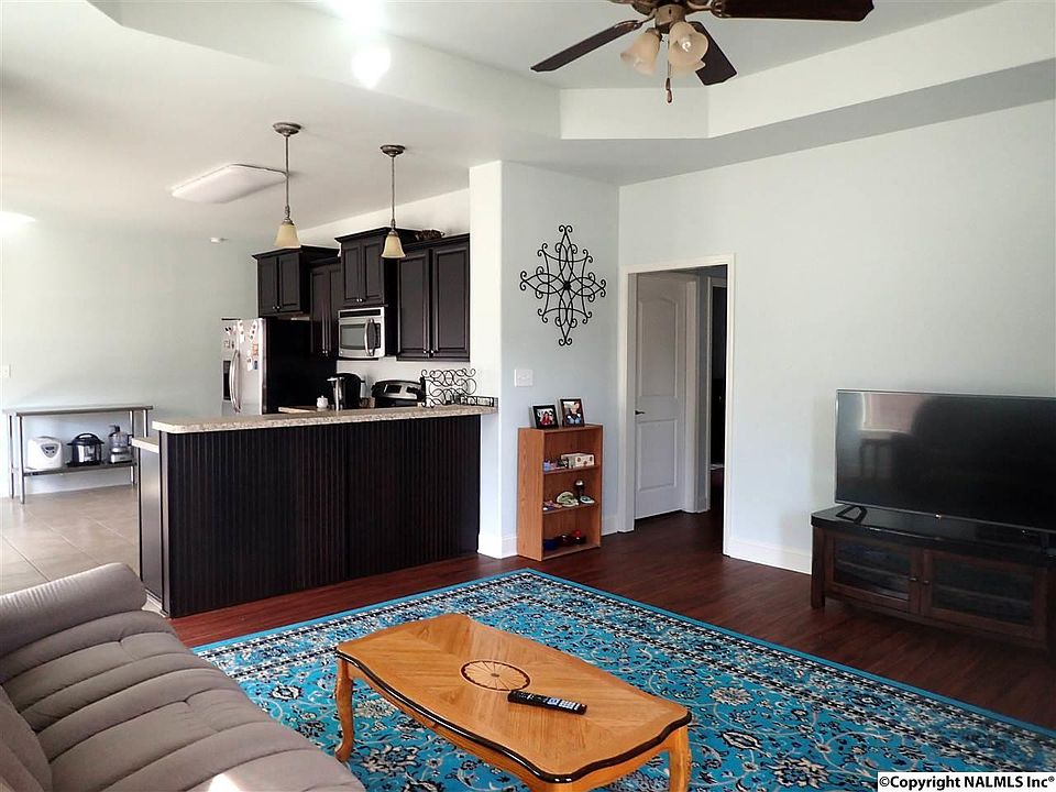 - LIVING ROOM DESC: 9? Ceiling, Smooth Ceiling, Laminate Floor, Ceiling Fan, Trey