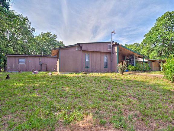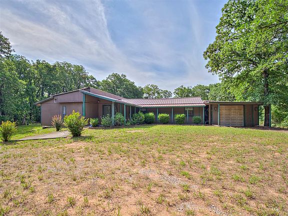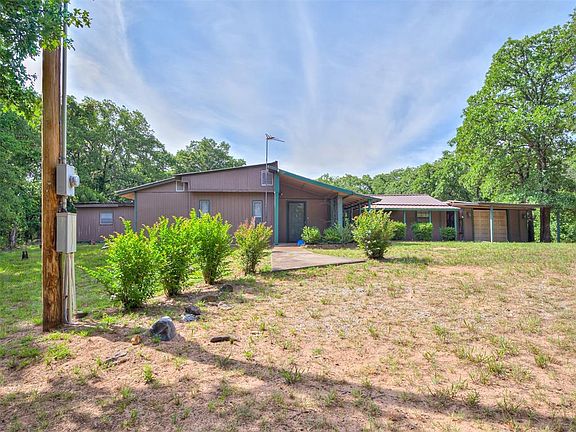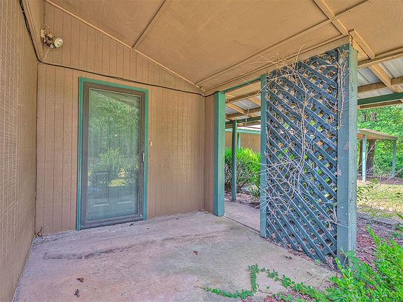 What a great price for this cute home nestled in 10 wooded acres on Slaughterville Road! The home boasts of 3 bedrooms, 2 bathrooms, two living areas and 2 dining areas. The master bedroom has a large walk-in closet. The kitchen has an island with a breakfast bar. The home has wall heaters and a wood-burning stove to provide heat and window air units for the summertime. The home seems to be very well insulated. The metal roof was put on in 2014. There is an outbuilding with electricity. The home is on well water. The 1000 gallon septic was replaced in 2018 and emptied in 2022. The above ground storm shelter was installed in November of 2018. The carport has a garage door on the front of the home. Property to be sold AS-IS.