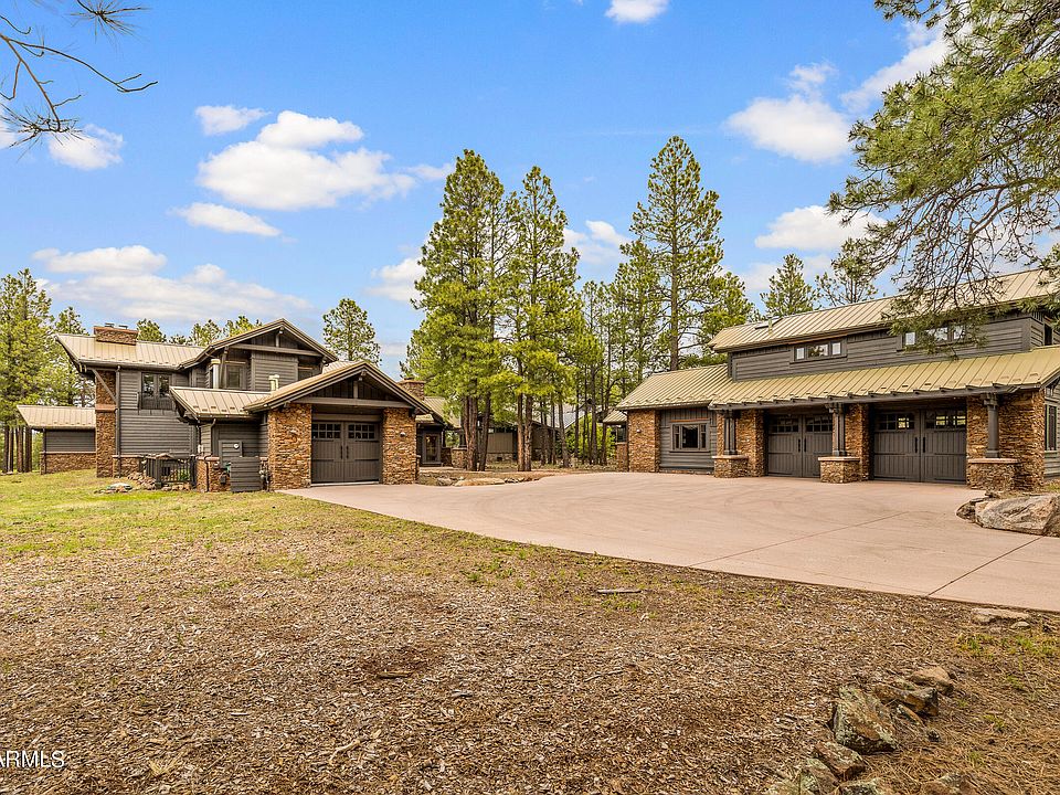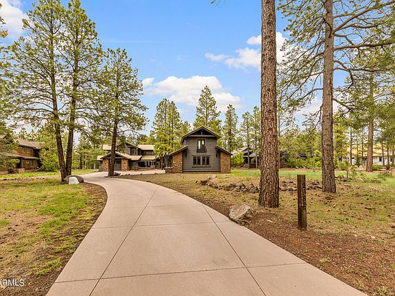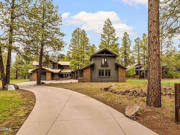 One-of-a-kind custom home in Forest Highlands with golf course views. The home is set back on a near-acre lot, with a separate guest house! Appointed throughout with unique windows, crafted iron hardware, stone flooring and numerous cozy nooks both within and outside the home. The eat-in chef's kitchen is spectacular with an adjacent den and a more formal dining area. The fireplaces in the living spaces are perfect for relaxing during the cool mountain nights. With an attached, garage, as well as a detached 2-car garage beneath the guest house, there is ample space for toys and guests. In addition to the 4 bedrooms of the main house, you'll find a library/den, office adjacent to main level master suite, and another family room upstairs. The home is a short walk to the Meadow Clubhouse.