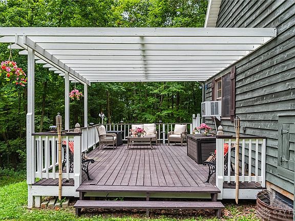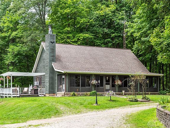 Beautiful quality built custom home, New Heating & Air System! This home offers custom floor plan, wooden slat vaulted ceilings, Great room, updated Kitchen with island. Numerous extras such as 4ft hall & doorways for easy maneuvering of larger objects, pocket door in upper bathroom, California walk-in closets, extra storage areas throughout and 4 bedrooms and 4 bathrooms. Walk-out balcony off upper master bedroom, great for those starry nights or early morning moments while overlooking neighboring pond & fountain providing relaxing sounds. Main floor includes 2nd master and 3rd bedroom. Large 'Lilly' wood burning stove. Pella windows, updated bathroom. Enjoy panoramic view of the wooded lot from large wrap around deck on side and rear or from the all-season porch encompassing the front of the house. Walk-out basement adds large family or bonus room, kitchenette, great for entertaining and 4th large bedroom and laundry room, Basement area can be used for in-law suite; guest stays or extra rental income. Basement includes large storage area or "shelter" room located under porch for weather safety. Property has all that nature has to offer from flowers, woods, creek, small pond and enjoy your own private space to rewind while walking through a covered bridge on the trails. The over-sized 3 car 2 story garage has an abundant amount of storage area, workshop or bonus room on second level while first level offers plenty of work area and large air compressor stays. Storage never ends, large pole barn, another smaller outbuilding and a sugar-shack which can be used as a club house or office. Land has 200+ maple trees that produced sap you can tap for Maple Syrup hobby or small side business. Property is truly a hunter's dream, providing game for all seasons and a closet safe for storing your valuables. Appliances convey with this property. This home is ready and waiting for you to move in, settle down and relax with your own little piece of heaven!