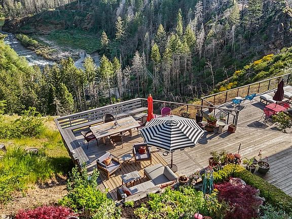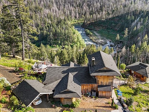 Incredible top-of-the-world estate overlooking the majestic North Umpqua River and surrounding landscape. This property is your quintessential luxury custom home with quick access to world renowned fishing. The property consists of 76 acres of Timbered hillside providing absolute privacy with abundant wildlife and the VIEWS! This property features three exquisite structures. The main home has one bedroom which is an upstairs master suite, office, two full bathrooms, living room with natural stone fireplace, hardwood and tile floors, and chef's kitchen with Sub Zero fridge, Wolf built-in oven, and granite counters. Timber frame trusses with ornate detail provide that warm rustic atmosphere expected in a mountain retreat. The second structure is a quaint 540 sqft cottage matching the architecture of the main home with a full bathroom, kitchenette, private deck, and ductless HVAC. The third structure is a detached 3 car garage, one bay has been converted into a heated art studio with a sink and built-in cabinets. In this same structure behind the garage is a private guest room with gas heat, private entrance, full bathroom with heated tile floors, imported decorative tile, and wine cellar. This property is truly one-of-a-kind with custom artistic attributes around every corner. Truly built for the elements with backup generator, wood fireplace, large propane tank, and egregious over-engineering. The multi-tiered, 1200 sqft deck with hot tub and tile shower rounds out this property, amplifying mother natures finest creations. Call today for a private tour.