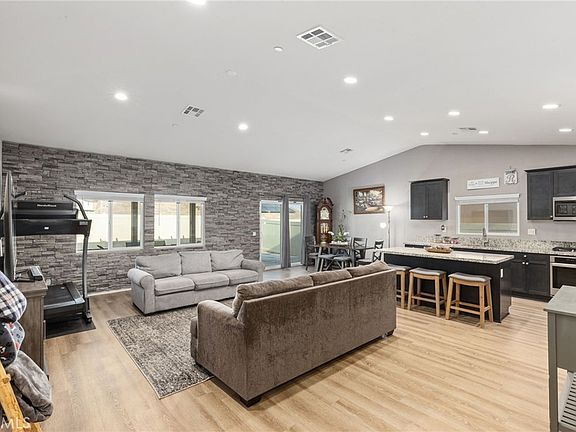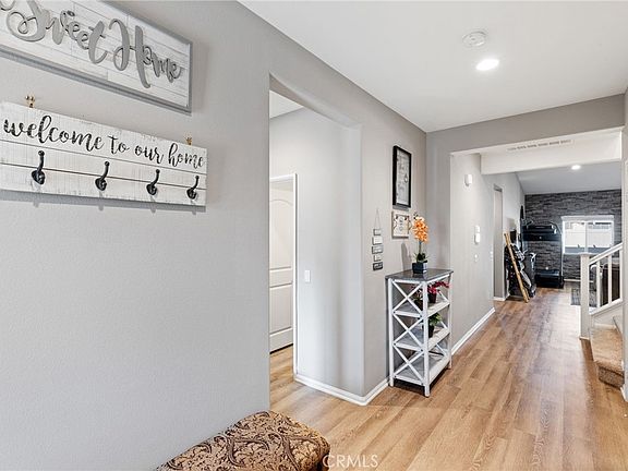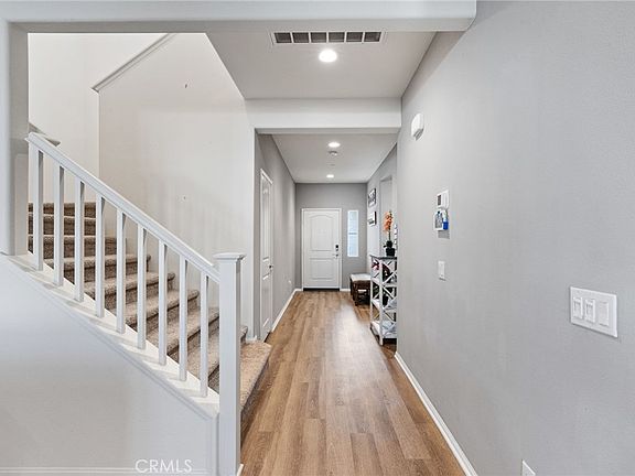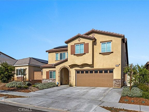 Welcome to your dream home in the desirable Audie Murphy Ranch community in Menifee! This stunning 2021-built home by DR Horton offers 2,519 sq ft of living space, featuring 5 bedrooms, 3 bathrooms, and a 2-car garage with overhead storage racks rated for up to 1000 lbs each. Upon entering, you're greeted by tall ceilings, recessed lighting, and durable LVP floors throughout the main living areas. The home boasts drought-tolerant landscaping with Wi-Fi-enabled Rachio 3 Smart Sprinkler Controllers and leased solar panels for energy efficiency. The main floor lives like a single story, with two bedrooms downstairs, including a spacious master suite. The master bedroom features upgraded carpet, a large walk-in closet, and an en-suite bathroom with dual vanities, LVP floors, and a spacious shower. An additional main floor bedroom with upgraded carpet and a full bathroom with a shower complete this level. The open-concept Great Room is flooded with natural light and offers ample space for entertaining. It seamlessly connects to the dining area and a gourmet kitchen, appointed with upgraded granite countertops, dark cabinets, stainless steel appliances, a walk-in pantry, and a large kitchen island. Upstairs, you'll find an extra-large loft that can serve as a movie room or additional living space, complemented by upgraded carpet throughout the entire second floor. Three spacious bedrooms on this level include one with a walk-in closet and two with standard closets. A secondary bathroom features a dual vanity, LVP floors, and a shower-tub combo. Step outside to your beautifully landscaped backyard with artificial turf, custom stone pavers, and a large Alumawood patio cover complete with two lighted fans. Enjoy mountain views from the front and backyard, custom drainage, and a stamped cement sidewalk extending from the backyard to the front for easy access to trash cans. The front and side of the house showcase custom stonework, and the extended stamped driveway adds to the home's curb appeal. Audie Murphy Ranch offers resort-style amenities, including heated pools/spa, clubhouse, meeting/banquet rooms, hiking/biking trails, sports courts for tennis, basketball, and soccer, a skate park, and highly-rated schools. Conveniently located between the 15 and 215 freeways and close to new shopping centers, this home is perfect for modern living. Don't miss this opportunity to own a beautiful home in one of Menifee's premier communities. Schedule your tour today!