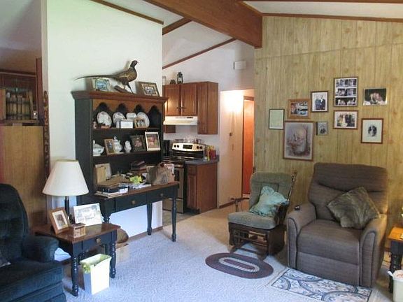 Located in a very private setting, yet close to town, you'll find this well maintained 2 bedroom home with 2 garages! Inside features a very spacious living room with a new bay window and newer carpeting. The dining area opens to the well laid out kitchen offering newer cabinets, lots of counter space and overlooks the quiet back yard. Full bathroom has a new vanity and solid surface counter top, and there are 2 large bedrooms that complete the main level. A full basement offers a finished office area, free standing wood burning stove, washer & dryer, utility sink and walk in shower. There is an attached garage, an exterior door off the dining area that leads to the large deck and 2 spacious garden areas, a storage shed and a detached 24'x30' garage. All this quietly tucked on a beautiful wooded 1.44 acres, only a few miles from town.