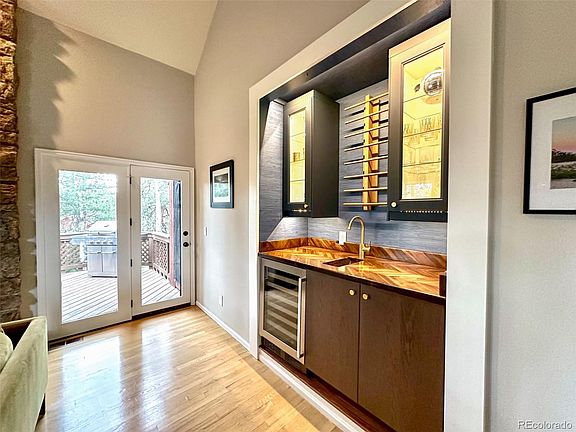 neighborhood trail about 100ft from the back door that leads to the beautiful Evergreen lake and the downtown hamlet of Evergreen. Minutes to shopping, schools, library and only 55 minutes to Breckenridge skiing and 25 minutes to Denver! The light filled home has been updated with new windows, new furnace, new roof, remodeled bathrooms, wet bar and painted throughout. You can take in the view from the 3 deck spaces around the home. The entry, living room and primary bathroom all have vaulted ceilings which open up the space considerably. All bedrooms have there own bathroom and you can easily turn the exercise room into another bedroom and still have an office space up in the cozy, quiet loft. Enjoy working from home or streaming TV with the available high speed