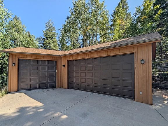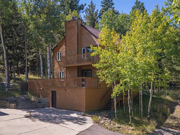 Nestled amongst verdant aspen trees on two private acres, this recently updated home offers a Colorado mountain retreat. Natural light streams in through newer windows inspiring a bright and airy atmosphere. An open living and dining area provides a seamless flow for entertaining. The chef’s kitchen boasts stainless steel appliances, a large center island and a cozy fireplace. Glass French doors open to a sprawling deck providing ample space for enjoying outdoor relaxation beneath the gentle shade of mature trees. Escape to the primary suite featuring private deck access, a walk-in closet and a spa-like bath with a soaking tub. Two additional bedrooms share a full bath. Downstairs, a finished basement hosts a rec room with a fireplace and a flex area ideal for a home office or fitness space. A 3-car detached garage and a shed offer plenty of storage space. Upgrades include a newer boiler. Located in Conifer Mountain, residents enjoy a peaceful locale with easy access to the Metro Area.