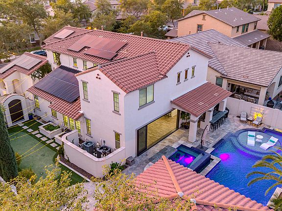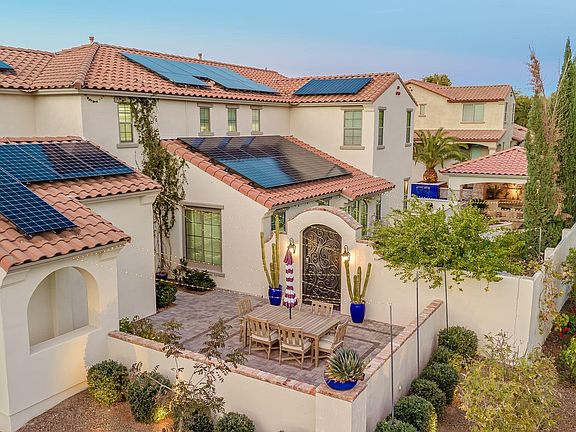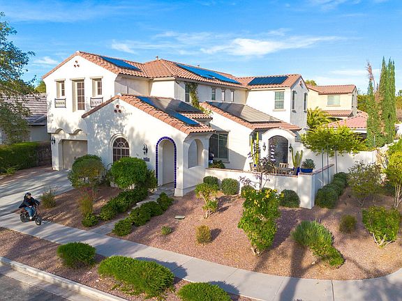 Luxury and livability come together in this beautifully renovated Verrado home with OWNED SOLAR, ideally situated on a quiet, tree-lined street. A custom iron door opens from a charming front courtyard with ample seating into the resort-style backyard, which is designed for entertaining, relaxation, and fun, featuring a heated saltwater infinity-edge pool with waterfalls, fire features, swim-up bar, travertine decking, and a built-in spa. An expansive outdoor living room offers a vaulted wood ceiling, fireplace, multiple TVs, dual bars, built-in BBQ, beverage refrigerator, and kegerator—perfect for year-round enjoyment.