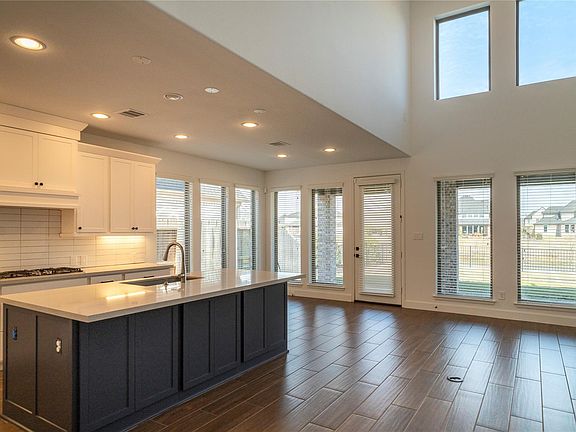 Home office with French doors and formal dining room along one side of two-story entry. Two-story family room with wall of windows and a fireplace, opens to kitchen and morning area. Kitchen features walk-in pantry, Butler's pantry and generous island with built-in seating space. First-floor primary suite. Dual vanities, garden tub, separate glass-enclosed shower and two walk-in closets in primary bath. A second bedroom is downstairs. Media room, game room and three secondary bedrooms are upstairs. Extended covered backyard patio. Mud room off three-car garage.