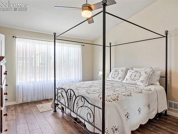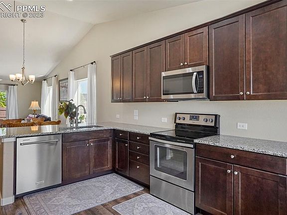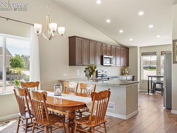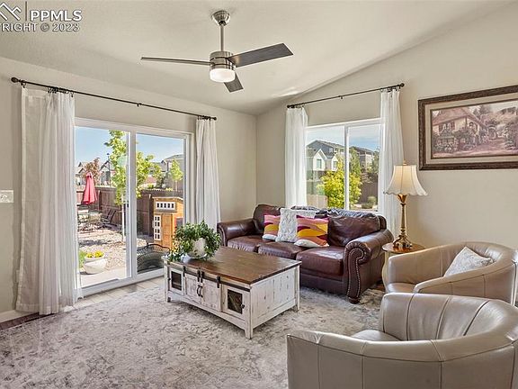 Better-than-new Ranch Floor Plan with Main Level Living. Thoughtfully designed with beautiful, upgraded luxury vinyl plank flooring throughout most of the main level and lower level family room. Light and bright with vaulted ceilings and large windows. Spacious Kitchen with pantry, granite countertops, upgraded cabinetry and stainless-steel appliances. Dining Area with wall space for hutch or buffet. Living Room with upgraded ceiling fan and walkout to patio. Plenty of outdoor living space with expanded 28x10 concrete/pavestone patio and second 8x8 pavestone seating area. The backyard is fenced and beautifully landscaped with garden beds, lawn, trees and automatic sprinklers/drip system, plus views of Pikes Peak! Master Bedroom with LVP flooring, vaulted ceiling, upgraded ceiling fan, walk-in closet and adjoining 5-piece master bath with double vanity, granite countertop with undermount sinks, jetted tub, separate shower with bench and tile floor. Bedroom #2 on main with vaulted ceiling. Full hall bath on main with tile floor and granite countertop. Spacious main level Laundry with tile floor (washer and dryer included). Downstairs, you will love the huge, multi-use Family Room/Rec Room with LVP flooring and plenty of space for entertainment and gaming. Two additional lower level bedrooms, Bedroom #3 with walk-in closet and upgraded ceiling fan, and Bedroom #4 with double door wall closet. Full lower level hall bath with tile floor. Additional features include upgraded wrought iron staircase spindles, upgraded carpet on stairs, Central Air, coat closet, linen closet, and storage in mechanical room. Plus, a highly-desirable south-facing driveway for easier snow removal! Fantastic location with easy access to Powers Blvd, steps from neighborhood park, and just a few blocks from Pine Creek High School and the brand-new Encompass Heights Elementary School (with STEM-focused curriculum). Plus, new shopping and entertainment districts are close by! Just a wonderful home!