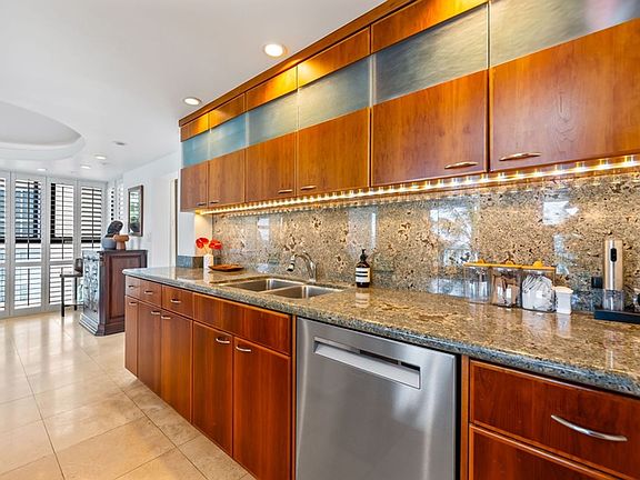 The sleek kitchen is designed for culinary delight, featuring high-end appliances, dark wood cabinetry, and generous granite countertops. Whether preparing a casual breakfast or a gourmet dinner, this kitchen has everything you need, including a wine chiller and both Nespresso and drip coffee makers for your morning routine.