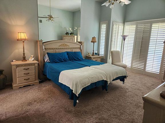Rare 3 bedroom Buena Vista floor plan with phenomenal views South and West to pond, Vista 3 green and mountains. This home is perfect for an entertaining family. Large wrap around patio with privacy! In ground spa on side. Extra-large lot! This home is truly amazing. Large kitchen with center island. Plenty of room for those big family dinners or dinner parties! Third bedroom/office has built in desk and shelves. All 3 bedrooms have attached full baths. Plenty of cabinets in garage for storage, and storage overhead. This home is at the crux of a cul-de-sac street with lots of charm and did we say amazing views and extra-large lot? The Desert Princess has an affordable 27-hole PGA Championship golf course. This quiet community is away from the noise yet minutes from everything that is in Palm Springs, restaurants, shopping, casinos, an international airport, the Tramway, Art Museum, Theaters, and the Street Fair. Land lease extended thru 2069 and monthly ground rent is $146.87.