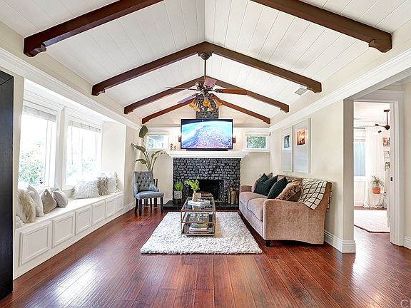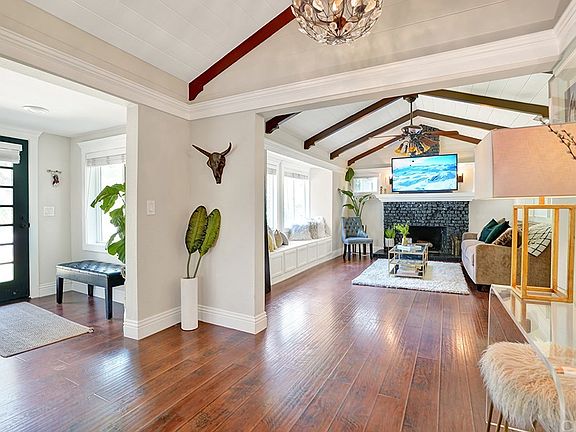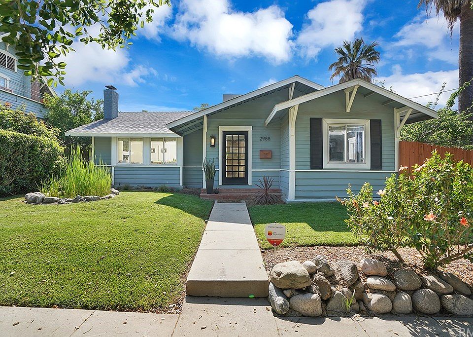 Welcome to a historic cottage home in the heart of Downtown Riverside. This turnkey 1905 home is a fusion between historic charm and today's modern amenities. Upon entering the home, you are greeted by an 11 foot vaulted-beamed foyer that carries into the living and dining areas creating exceptional flow, perfect for entertaining. Anchoring the living room, is a one of a kind klinker brick fireplace, and a sweeping bay window that is ideal for sitting back with a book and coffee. Off the living room is a bedroom, full bath and en-suite that has been fashionably renovated. Dining area is open to the wide galley kitchen with white quartz counter-tops which extend up the back-splash for a contemporary look. The home features laminate flooring, recessed lighting and a tankless water heater that provides hot water to your indoor laundry. The charming yard has two patios for gatherings and entertainment. Additionally, there is a side patio right off the dining room that has custom concrete pavers with white lights for those perfect summer nights. Backyard is well manicured with additional custom concrete pavers leading to your garage and 2 car parking area. This is a quintessential historic home that fulfills all your contemporary needs with a short walk to the Mission Inn, Food Lab and Fox Theater.