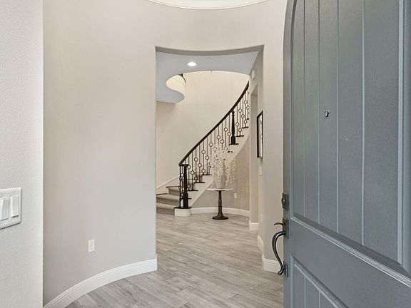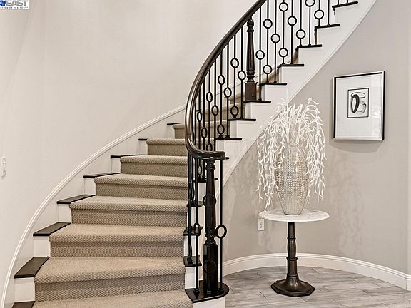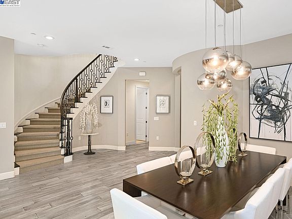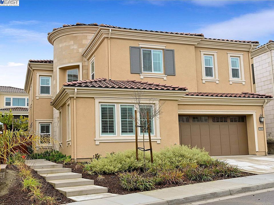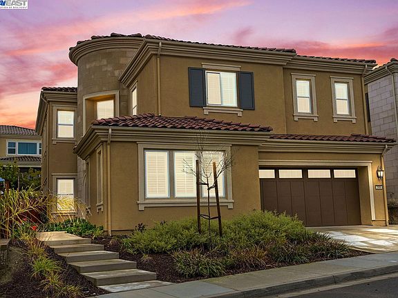 The Sherwood Mediterranean floor plan by Toll Brothers, located in the highly desirable Tassajara Hills. This stunning property has been maintained like a model home. So many unique features, including the grand entryway rotunda with high ceilings, elegant spiral staircase, immaculate hardwood and tile flooring. This home offers a downstairs bedroom and bathroom, a great option for multi-generational families. The Gourmet kitchen features a large kitchen island, gas range, and has a very large walk-in pantry/storage area. There are washer and Dryer hook-ups upstairs and downstairs. The loft serves as a great flex space. The spacious owner's suite has a large walk-in closet and a luxurious bathroom with a walk-in glass enclosed shower, free-standing soaker tub, with dual sink vanity. Beautiful, easy to maintain backyard with paver patio, turf, vegetable garden, and fruit trees. Owned solar. This home is located near high ranking Dublin schools, shopping, parks, and close to BART & freeway access.
