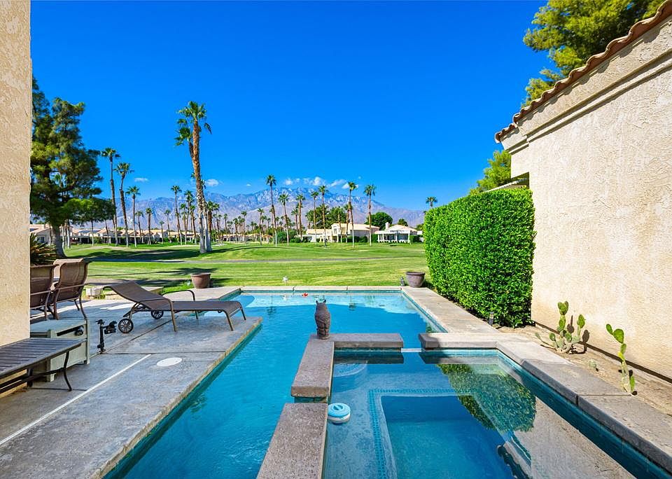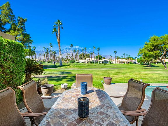 Welcome to your own slice of paradise at Desert Princess Country Club! This stunning two-story, 1,461 sq. ft. retreat is the ultimate desert getaway, offering dual primary suites, panoramic west-facing views, and your very own private pool and spa overlooking the fairways and the majestic San Jacinto Mountains.Step inside to discover vaulted ceilings, an open-concept living area, and a natural sense of indoor-outdoor harmony. A striking rock fireplace creates a warm focal point in the living room, while the adjoining dining area opens to a side patio perfect for outdoor grilling and casual gatherings. The kitchen features a breakfast bar overlooking the living space, ideal for morning coffee or entertaining guests.Beyond the living room's sliding doors awaits your private sanctuary, a pool and spa patio set right on Hole 2/11, where manicured greens stretch toward the San Jacinto Mountains. Here, evenings come alive with fiery desert sunsets, creating the perfect backdrop for relaxation or entertaining.Both primary suites provide a sense of comfort and privacy, each with a spa-like ensuite featuring a soaking tub and separate shower. The lower-level suite opens to the pool patio and includes a walk-in closet, while the upper-level suite offers a private balcony with serene views of the golf greens and pool perfect for morning coffee or sunset relaxation.Convenient features include a main-floor guest bath and a laundry closet off the kitchen with direct access to the two-car garage and golf cart space.Enjoy the exceptional amenities of Desert Princess Country Club, a pristine 250-acre gated community offering 27 holes of championship golf, over 30 resort-style pools and spas, lighted tennis and pickleball courts, a state-of-the-art fitness center, racquetball, basketball, a full-service spa with sauna and lap pool, and an on-site restaurant and bar. The clubhouse also features the Lagos Cafe, Mountain View Grille, golf pro shop, and multiple meeting spaces-all within a guard-gated community with 24-hour security.Conveniently located just minutes from Palm Springs International Airport, downtown Palm Springs, and with easy access to the I-10 freeway, this home perfectly blends resort-style living with everyday comfort and convenience.