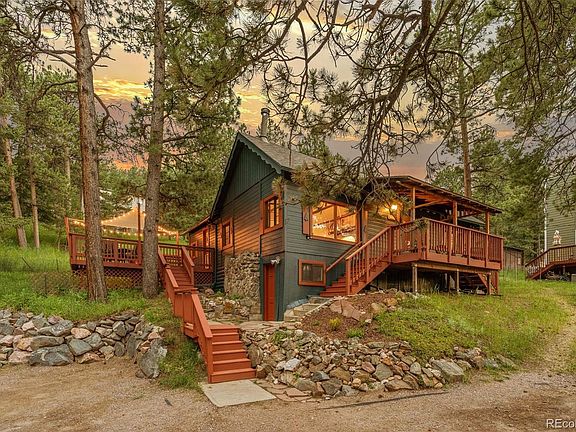 Welcome home to 29892 Spruce Road! Please visit 29892SpruceRd.com for a narrated video tour, floor plans, 3D tour, and more. Built in 1935, this is your opportunity to own one of the original cottages in Wah Keeney Park! The appeal of this quintessential mountain home is unmistakable from the time you step onto the welcoming covered front porch. In the living area, historic details include the locally sourced hand-hewn beams and railings, charming original windows, and freestanding wood stove. Vaulted ceilings, abundant natural light, and an open floor plan enhance the character of this inviting home. The kitchen is remarkably spacious for the era in which this property was built. You’ll appreciate the dine-in eating area and direct access to the large deck which is perfect for grilling and entertaining. The two main floor bedrooms, one with a generously-sized walk-in closet, share an updated bath with a double vanity. The cozy loft space could serve as a wonderful play area, reading nook, or guest bed space. Back outside, you’ll notice that the peaceful treed lot offers plentiful parking. The convenient exterior entrance to the 450+ sq. ft. basement makes it the ideal storage space for your outdoor gear and tools! This home has been meticulously maintained with brand new interior and exterior paint and newer luxury vinyl plank flooring throughout most of the home. Wah Keeney Park offers easy access to I-70 for Denver commutes or trips to the mountains as well as close proximity to all Evergreen dining and shopping amenities. Walk or bike to nearby Elk Meadow Open Space Park to enjoy over 14 miles of trails!