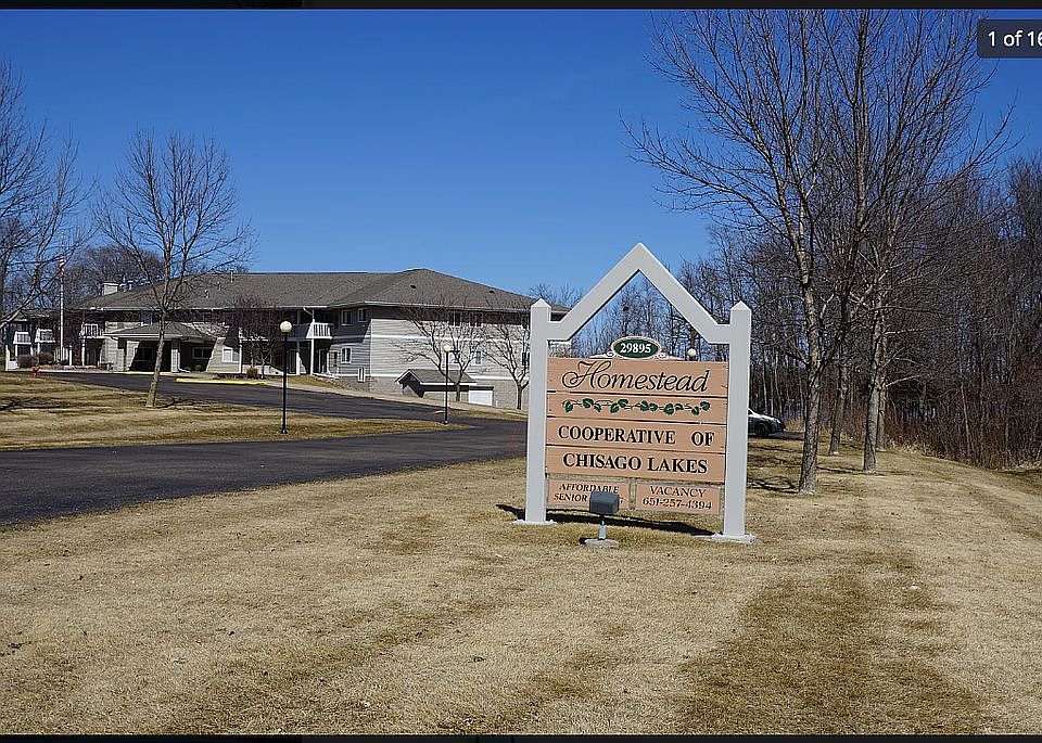 Available now. Very Nice 1 Bedroom co op unit on second floor (end unit) with elevator and attached outdoor deck at 25 unit complex at Homestead Coop (At least one person in each unit must be 55 or older) in Chisago City MN on Wallmark lake. This unit is 700 sq.ft. with all appliances included. Lots of storage with 2 walk in closets and a 6x12 storage room downstairs. Heated underground parking is included for one vehicle in the monthly fee stated. Cable TV, WI-FI internet, Heat, AC, Utilities, Garbage, building Maintenance snow removal, and lawn care are all included in the monthly fee. The only thing extra is if you want a phone. There is also a workshop, crafts / exercise room that also has a pool table, Guest room (like a 2 bed hotel room) for daily or weekly rental and a fully equipped party room for larger gatherings up to 35 people. Nice, clean and well maintained building with park like grounds. CALL Jan (owner) 715-817-8832 and leave a message so I can return your call.