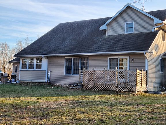 Beautiful custom built home located on 6 acres surrounded by trees and corn fields. The main level of this home features the master suite with walk-in closet and bathroom, home office, open concept living room, dining room, kitchen, 3 seasons porch, laundry room and full bathroom. The second level of this home has 2 bedrooms with a full bathroom. The basement includes a non-conforming 4th bedroom suite with attached full bathroom and walk-in closet. New in 2022 was the addition of the 3 seasons porch along with an exterior concrete patio large enough for family gatherings. The insulated garage doors and openers were just installed in the Summer of 2022. The Morton building/garage offers additional 4 car parking or parking for all your toys!!
