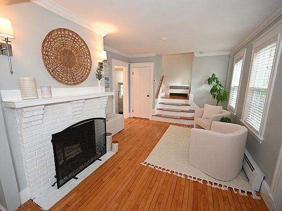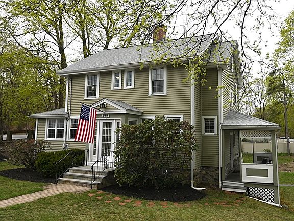 Move right into this 8 room one full one half bath center entrance colonial set back from the street, enter the breezeway and feel the warmth of this home with an abundance of windows, high ceilings, crown molding, and hardwood floors throughout. Natural sunlight fills the living room with fireplace. The open floor plan flows seamlessly into the family room. The spacious dining room with slider out to new (2022) composite deck overlooks private yard complete with custom shed (2022). A newer kitchen featuring quartz countertops, soft close cabinets and drawers with a center island that is perfect for entertaining. Upstairs you will find three bedrooms and a bonus room fit for an office or nursery, and an updated family bath. Enjoy the finished lower level with direct walk out to the backyard, or a summer afternoon on the covered side porch. Updated systems. Great location! Close to all major routes, aqueduct trails & Eliot School. Easy to show.