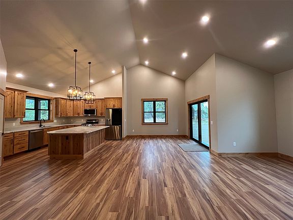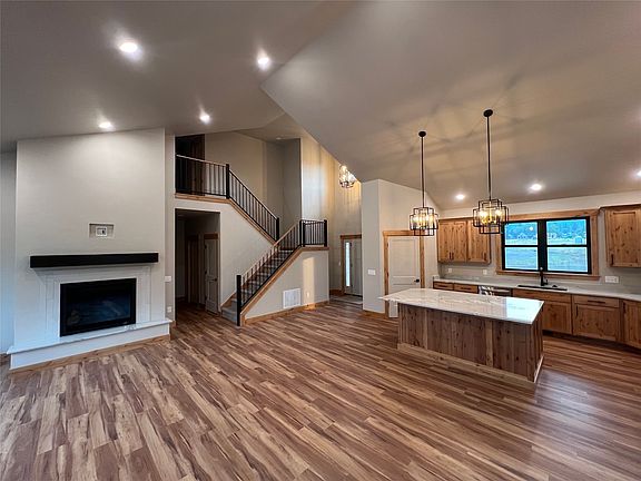 Beautiful new construction home with 5 bedrooms & 2.5 bathrooms boasts on open floor plan & numerous amenities. Abundant windows & oversized sliding glass door from the dining area to the covered back patio allow for beautiful views & natural light. Quartz countertops & custom built, knotty alder cabinets throughout. LVP throughout the main floor with carpeted bedrooms upstairs. Gorgeous great room with vaulted ceilings that open to the second floor, tile finished fireplace with quartz hearth & custom built mantle. Spacious kitchen with walk-in pantry, large island with bar seating, smudge resistant stainless steel appliances & numerous cabinets with crown molding & under cabinet lighting. Main floor primary suite with large walk-in closet, walk-in tile shower, double vanities, & linen closet. Call Tara Zeiler at 406-239-8272 or your real estate professional for more details or to schedule a showing. There are also additional lots in this subdivision available for land/home packages.