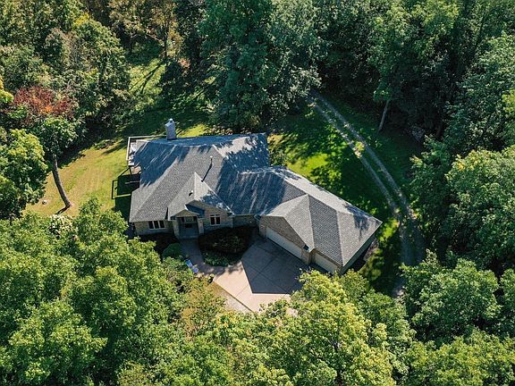 You've found it!! Nestled on 5+ acres of wooded serenity, this meticulously maintained walkout rambler offers a true sanctuary-like retreat while being close to tons of restaurants and shopping! Step inside to a warm, welcoming space filled with natural light and vaulted ceilings. The kitchen is ideal for both meal prep and entertaining, with beautiful hardwood floors, pull-out cabinets, and ample storage. Start your mornings on the deck with a cup of coffee, surrounded by nature’s beauty. Main level features a primary suite with a spacious bathroom, double sinks, separate tub and shower, and walk-in closet. Convenient main-floor laundry adds to the ease of living. Cozy up by one of the two fireplaces, either in the living room or the lower-level family room. Walkout lower level also offers two additional bedrooms, 3/4 bath, and fantastic storage space. Step outside to enjoy the lush backyard, framed by trees and wildlife, or relax on the patio. The oversized garage offers even more room for storage or projects. New roof in 2022 comes with a 50-year warranty, ensuring peace of mind for years to come. This home is a perfect blend of nature, tranquility, and modern comfort. Don't miss it!!