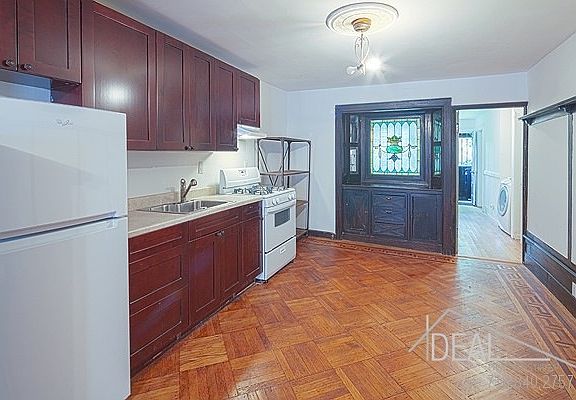 Occupying the garden floor of a gorgeous limestone townhouse, this two bedroom apartment is filled with beautiful late 1800's period detail such as built-ins, stained glass, woodwork, and incredible parquet floors. Enjoy the brand new kitchen, the double sinks in the spacious and renovated bathroom, two bedrooms, laundry in the unit, and a huge backyard. Near the 2,5 trains at Sterling St. and the B,Q at Prospect Park, you will love the location just three blocks from Prospect Park. Available September 1st. Pets accepted on approval.