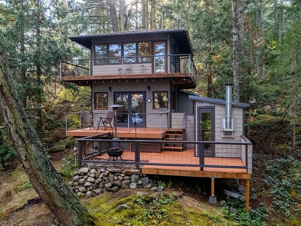Looking for a perfect idyllic getaway? This unique custom built PNW cabin evokes the image of a historic fire lookout with multi-tiered decks and artful wood finishes throughout. Go to sleep under the stars and wake up looking out into 365 degrees of forest canopy.  Beautiful inside and out! Indulge yourself in the cedar sauna or sit by the firepit with your favorite beverage. A pretty path leads to a second parcel containing a delightful 10x12 wood shop,120 sf studio and 1/2 BA. At just over an acre, there are plenty of spaces to stretch out and find what you need to revitalize. 30 min by water taxi. 2 docks, airstrip, waterfront picnic areas, clubhouse, caretaker. Incl furnishings, Livingston skiff & electric golf cart. Poss Seller Fin