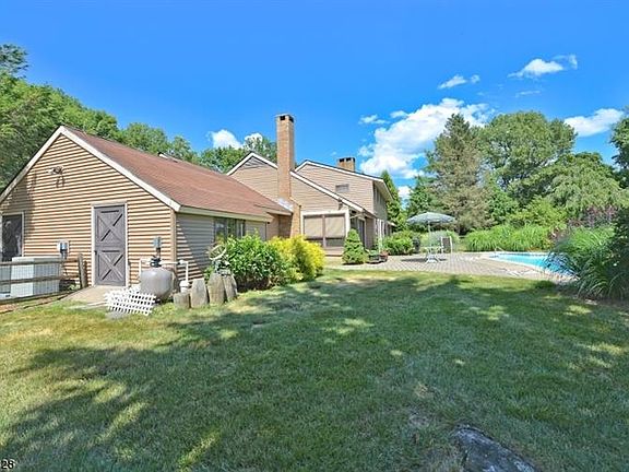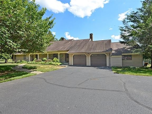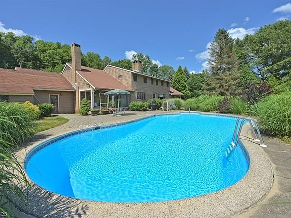 Custom Cape set on 6+ acres with great views, surrounded by Hunterdon County Parkland for complete privacy. A 30X50 outbuilding w electric. Large country kitchen w granite counter tops, Breakfast bar, tile backsplash, ceramic tile flooring and large pantry. 1st floor master bedroom w full bath. radiant floor heat, sauna and access to outside. Living room and 1st floor den w built ins and hardwood floors. Florida room w slate flooring and sliders to patio and in-ground cement pool. 2 bedrooms and full bath, large walk in cedar closet complete 2nd floor. 3 fireplaces w 2 Vermont casting "Vigilant" wood furnace and 1 Jotul wood furnace. OB Dimensions , Peak of ceiling, 15 ft. Door opening 9 ft. 8 inches high, 11.7 wide. Inside height to rafter 10.7 feet