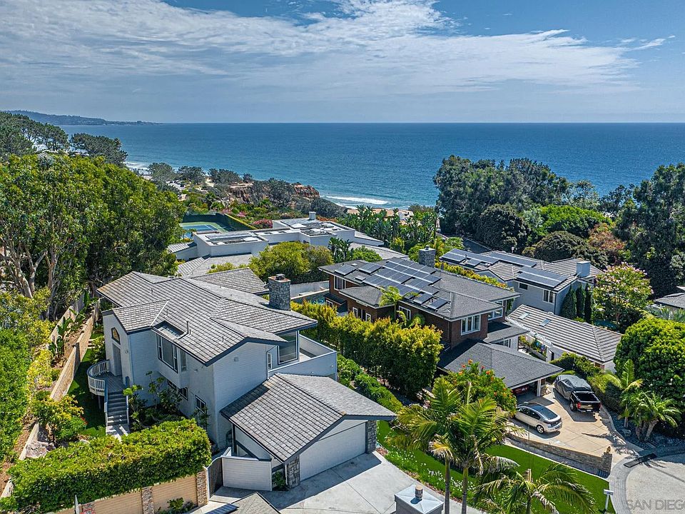 Two blocks from the ocean with panoramic ocean views to La Jolla and sunset views to the West, enjoy the beach lifestyle at its finest! First time on the market, well located west of Camino Del Mar in a very private gated community, a spectacular recently updated coastal residence. A dramatic entry greets you as you enter this four bedroom residence, hosting a generous private primary suite with sitting area, a master bath with new custom tiled shower and soaking tub glowing in sunshine from a well-placed skylight, an ensuite secondary bedroom with private bath, two more bedrooms perfect for an office or guest suite. Additional ocean views are experienced from the wrap-around deck and family room, a well-equipped kitchen with a newer oven and microwave, gas range, custom tiled backsplash. A recently painted interior features neutral colors, high vaulted beamed ceilings, and an open concept floor plan that is showered in natural light. Low maintenance yard with turf and beautiful waterfalls. Exceptional surf access as you are steps to Torrey Pines State beach via the nearby access path just outside the gates. Well appointed indoor laundry room and two car garage. Blocks to Olde Del Mar and the Del Mar Racetrack.