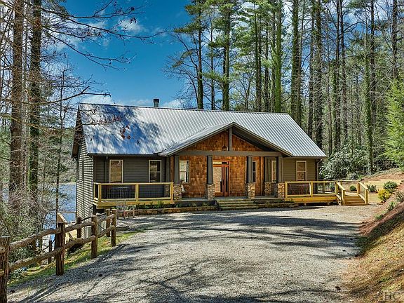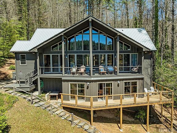 Conveniently located between the quintessential mountain towns of Highlands and Cashiers, NC, this remarkable lakefront property spans 1.82 acres beneath Whiteside Mountain. Boasting more than 3,000 square feet, this 3BR/3BA sanctuary descends to Holly Berry Mountain Lake, one of only seven homes on its shores. Approaching along a tree-lined drive, rustic locust-cut railings and terraced landscaping guide you to ample parking for six cars. Wrap-around wood decking and towering stone portals welcome you and the central slate patio beckons. Inside, a great room with floor-to-ceiling windows reveals breathtaking forest and lake vistas. Warm wood floors, soaring ceilings, and a new gas stone fireplace adorn the space. The open plan effortlessly integrates the living, dining, and kitchen areas, which has granite countertops and ample cabinetry. A pantry and spacious laundry room lead to a front wraparound porch. The master bedroom features high ceilings, a walk-in closet, and a spa-like en suite bath. Another bedroom boasts an en suite bath and double door closet. Downstairs, guests enjoy a living room with lake views and access to an enclosed porch with heated tile flooring and a separate deck space. A third bedroom and full bath complete this level. Outdoors, a Trex dock invites fishing and leisure on the lake. Special features include a partial-house generator, 2023 HVAC system, gas fireplace, landscaped yard, and new plantings. The crawl space is fully encapsulated.