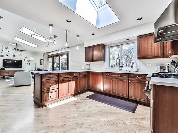 Mid-Century Modern Home back on the market after buyer contingency fell thru. New Roof and New Electrical Panel 11/19. Large rooms in this open concept home made for entertaining. Chef's kitchen features white quartz countertop, Ann Sacks tile, Wolf Stove, Miele & Jenn Air appliances. Kitchen opens to an inviting family room with vaulted ceiling w/skylights, fireplace, expansive sliding glass door to your patio & private fenced yard. Dining and living room all overlook new landscaping. Master suite with three closets, brand new designer master bath with stand up shower. Lower level family room, office with/murphy bed quickly transitions to a guest room, full bath on the lower level. Mud room, pantry, powder room, attached garage & ample storage, this house has it all! Oversized corner lot with professional landscaping & new front patio. Taxes have been successfully appealed and will be lower.