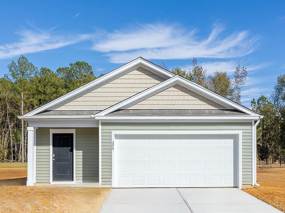 The DOWNING floorplan features a large kitchen space, a first-floor primary bedroom with a walk-in closet, and two secondary bedrooms. The garage provides additional storage space. Photos are a depiction of a similar home.
