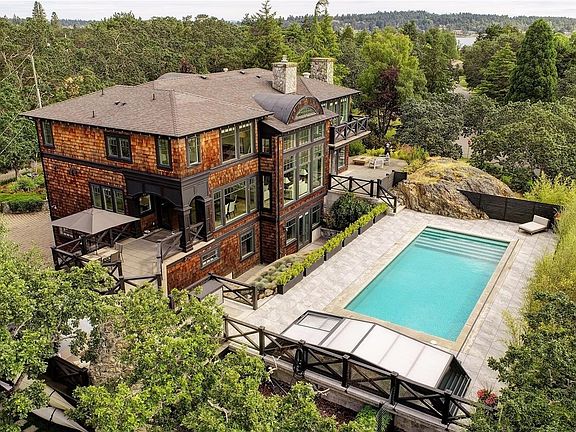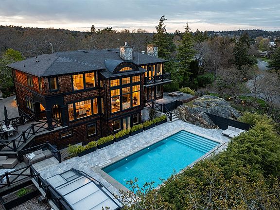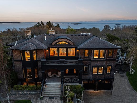 Perched high on a hill with captivating ocean and mountain views is this epitome of grand estate excellence, architecturally stunning and masterfully built on 0.8 private acres adorned with beautiful, manicured gardens! A grand entry sets the stage and showcases the designer interior which is flooded with natural light. Soaring ceilings punctuate the main living spaces, with a generously sized living room enhanced with an artistic gas fireplace. The chef’s kitchen is well appointed for the culinary inclined, fitted with upscale appliances, custom cabinetry, stone counters, a butler’s pantry and island seating for casual dining. The regal dining room is open and airy, ideal for entertaining. A comfortable family room, an office/den with gas fireplace and a stylish powder room complete the main floor. One wing of the top floor includes the master with a lavish double-sink ensuite, a generous dressing room and a private balcony. Across a corridor that opens to below is a second wing with a laundry room and two large bedrooms sharing a full bathroom. The walkout lower level is an entertainment haven! The fully equipped media room features a wet bar, an additional bedroom and bathroom, tons of storage and garage access. Premium outdoor living with many relaxing patio spaces, including an outdoor firepit and outdoor covered, heated tiled pool to enjoy year-round. Prime location with direct access to the walking trails that lead to Uplands Park, Cattle Point and Willows Beach, plus a wide array of world class amenities nearby. The Uplands community is known for its exclusive sprawling estates, abundant ocean frontage and picturesque setting. Residents enjoy the charming and friendly atmosphere of the nearby Oak Bay village including boutique shops, cafes, restaurants, art galleries, bistros, grocery stores and community services. Oak Bay is the most prestigious and well-maintained community in Victoria with world class golf courses, marinas and numerous parks and beaches, all offered with the convenience of Downtown and the Inner Harbour minutes away.