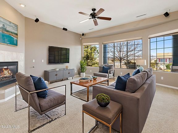 Welcome to small-town charm in the heart of Chino Valley, where this beautiful single-level home in the sought-after Appaloosa Meadows neighborhood awaits. With partial stack stone columns, a gingerbread facade, and low-maintenance mature landscaping, this home offers fantastic curb appeal. Inside, the tiled foyer opens to a spacious great room featuring a bayed area with oversized picture windows, a gas fireplace with a tasteful tile surround, and built-in surround sound speakers. The open-concept layout seamlessly connects the great room, dining area, and kitchen, creating an inviting space perfect for entertaining or daily living. The dining area offers stunning mountain views and overlooks the expansive backyard, providing a serene backdrop for meals. The chef's kitchen is a standout.