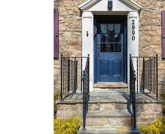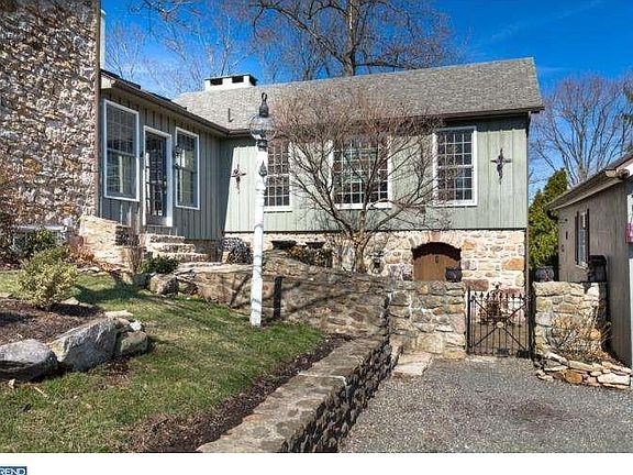 Located in a delightful village post card setting is this classic Bucks County stone home C. 1838. Welcome to âTall Pinesâ, a stone beauty set amidst an enchanting half acre with stone wall terraces and white picket fenced gardens. Step inside to a beautiful home with wonderful charm and character and modern amenities for todayâs life style and comfort that seamlessly blend with its antique identity. Fine craftsmanship is displayed in the random width pine floors, open beam ceilings, butterfly staircases, stone and plaster walls, deep window sills, and 4 stone fireplaces. The kitchen features modern appliances plus hand crafted cabinetry, a wood burning fireplace to grill or roast on an open flame, a sky-lit breakfast bar and a café nook. The Formal Dining Room embraces its own stone fireplace and leads outside to a large open deck for outdoor entertaining. French Doors open to a generously sized family room with a massive palladian window and views overlooking a private courtyard patio and greenery. Four levels of living space offer a versatile floor plan of 3 Bedrooms and 4 full Baths to include a possible separate guest suite or home office with separate entry. Enjoy outdoor living and dining from the deck enhanced by woodland views, or from intimate patios inspired by stone walls and private gardens. An oversize 1+ car garage and a sweet garden shed complement this lovely treasured property. The stewardship passes forward to appreciate and love this wonderful home!